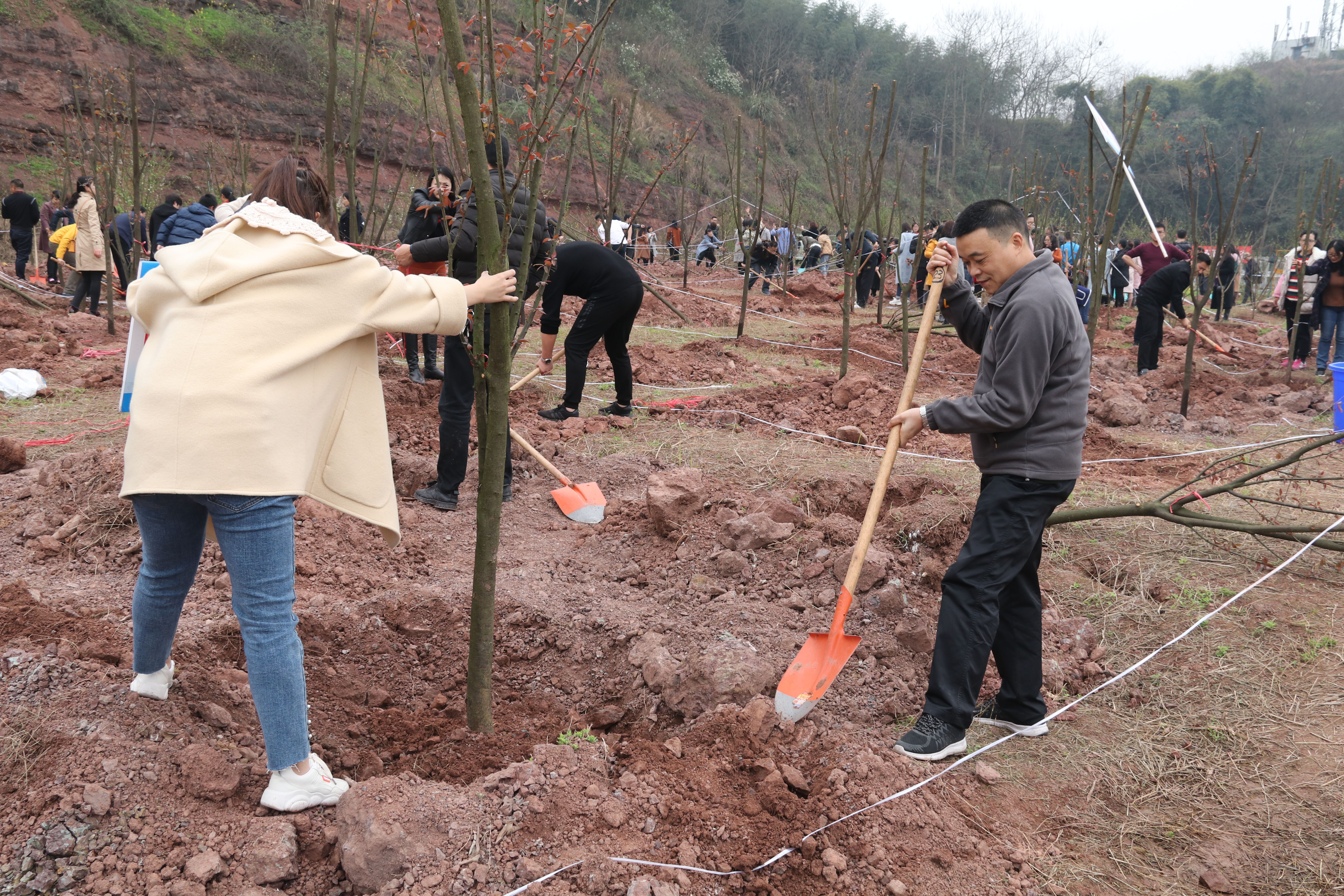 中午一点,会员们集结到指定区域,卷起袖子投入到热火朝天的栽植活动中去,在大家的密切配合下,挖坑、放苗、填土、培土、浇水……动作一气呵成,一棵棵树苗错落有致地点缀在原本空旷的平地。